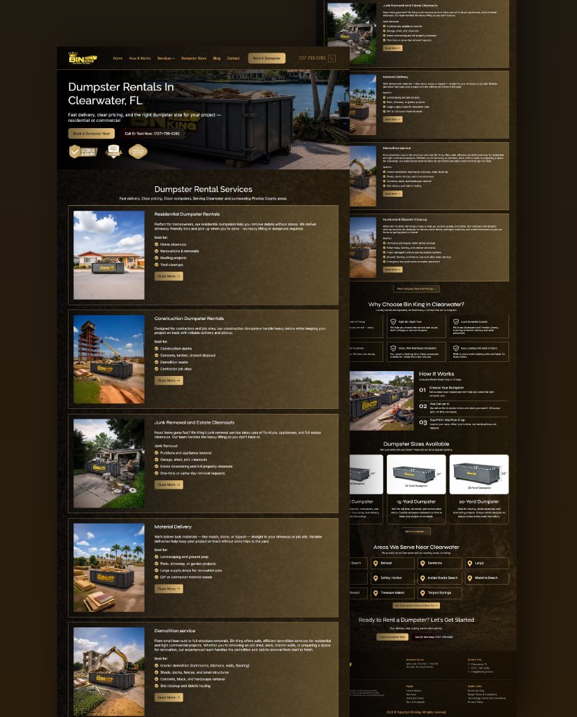 Since this was a new website, the goal was to create a structure that clearly explains services, bin options, and how customers in specific locations can request a dumpster. The site needed to feel straightforward and locally relevant, helping visitors quickly understand whether Bin King serves their area.